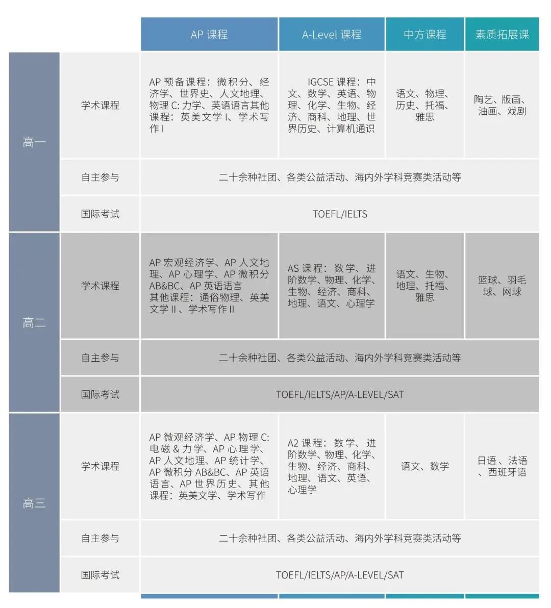 除学科课程外,附中国际部还提供了特色语言课程、中方课程以及素质拓展课,全方面培育英才。