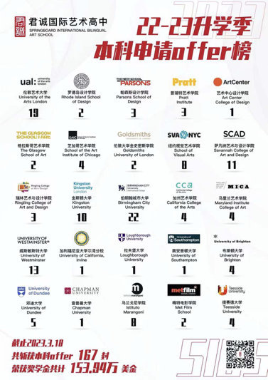 随着22-23的申请季接近尾声,君诚国际艺术高中在申请季中拔得头筹,截至日前,荣获海外院校OFFER172封,共获奖学金162万美金。其中,2023QS艺术与设计专业全球排名本科阶段TOP1“英国伦敦艺术大学”直录OFFER 20封;排名第3名的“美国罗德岛设计学院”OFFER2封;排名第4名的“美国帕森斯设计学院” OFFER 3封;排名第6名的“美国普瑞特艺术大学”OFFER 3封!
