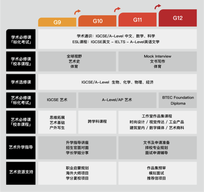 学校在高中学段(G9- G12)开设国际艺术课程,旨在为有艺术天赋和特长的学生提供完备专业的艺术升学路径,全面培养学生综合学术能力、审美感知、艺术表现、创意实践,进而衔接世界一流艺术类高等学府。