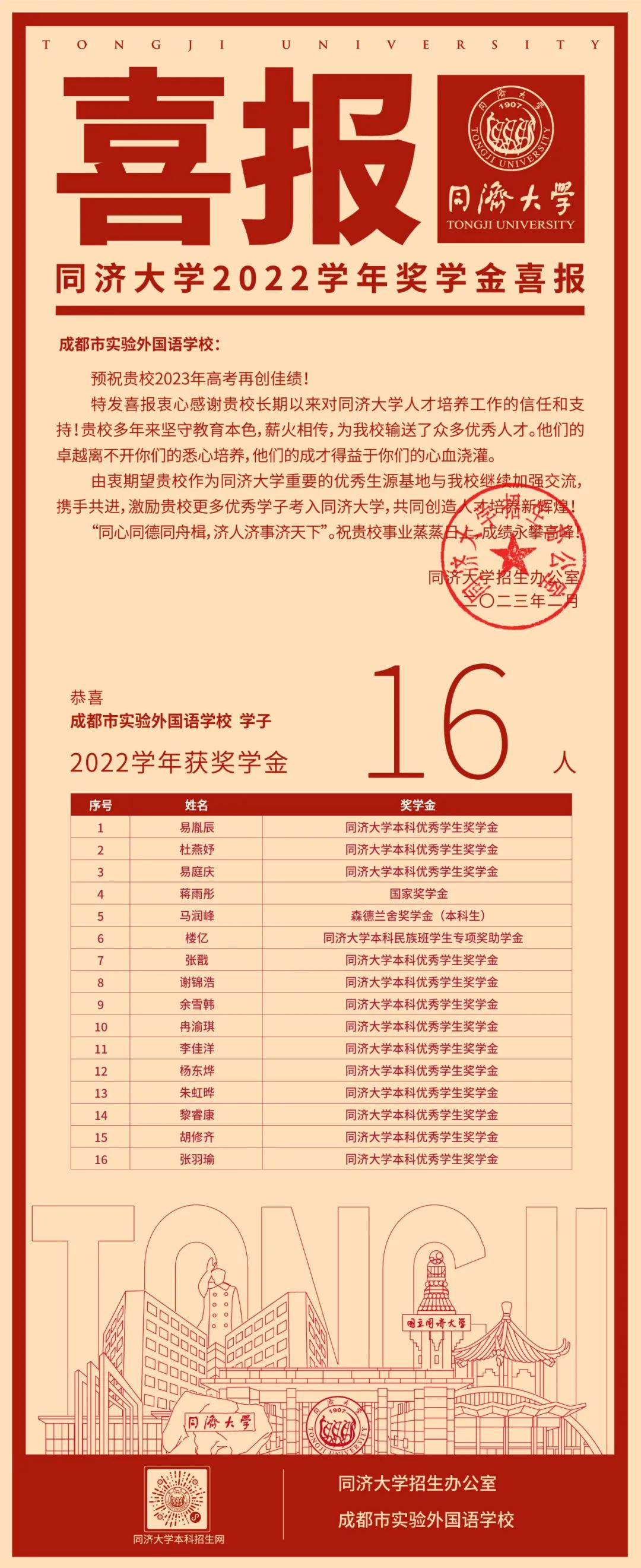 (三) 〖成都市实验外国语学校:16人斩获同济奖学金! 〗链接地址:https://guojixiao.com/z/37099.html , 转载时请注明来源及保留本站链接。