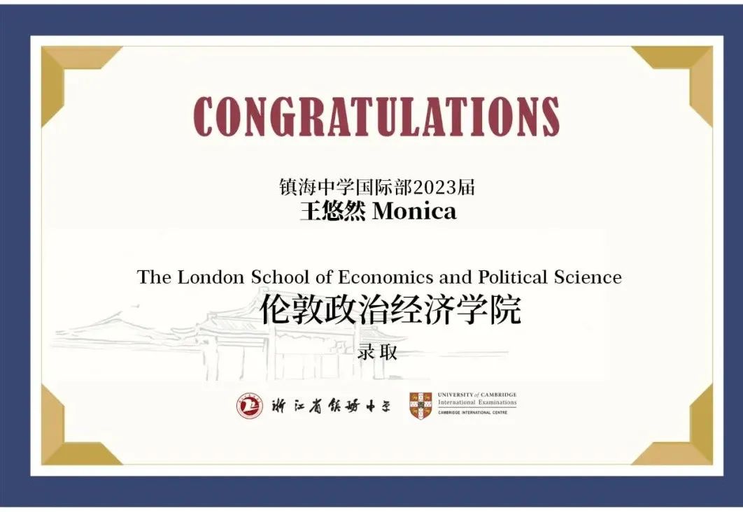 镇海中学国际部学子王悠然拿下伦敦政治经济学院(LES)OFFER!滕雨芮同学摘得帝国理工学院的OFFER!
