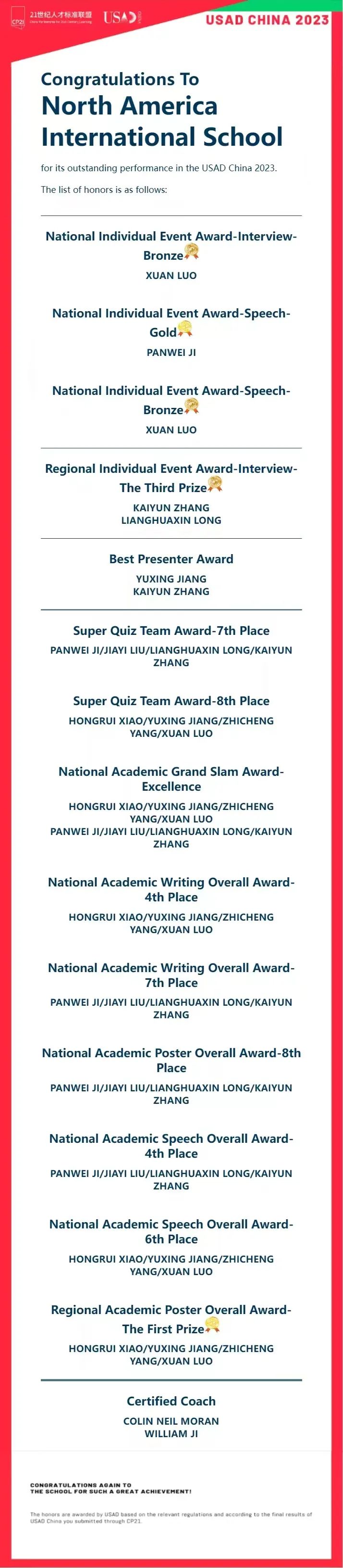 例如,在2022 USAD美国学术十项全能竞赛中,诺美学子拿下多枚全国个人金奖(前1%)、银奖(前2%)、铜奖(前4%),参赛团队获全国第7名并成功晋级全球赛;