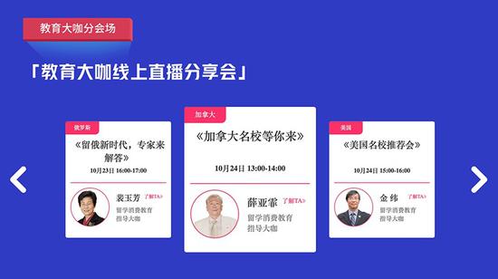 除了来自各国名校的招生代表,在教育大咖分会场上,还有金吉列留学消费教育学校指导专家带来线上直播分享会,有金纬教授带你领略美国名校的常青树风采,薛亚霏先生跟你面对面聊聊加拿大名校申请技巧,裴玉芳教授为你解答留学俄罗斯的优势,王百哲先生对英国院校及其录取条件进行分析,还有潘晓景女士为你指导申请日本院校应该注意的要点。五位专家将依据多年海外留学、工作、生活经验,为大家带来权威的留学攻略与解析。