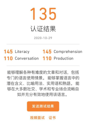 好消息不止于此,13年级的Shelly代钰薇同学在多邻国(与雅思、托福相当的语言测试考试)考试中取得了135分(对应雅思7.0-9.0)的好成绩。本是很普通的一次语言考试,这娃却遇上了所有对成绩不给予认证的情况,“口语与题目不符合”“感觉口语提前准备”“检测环境不过关”…经过无数次申诉,终于在最后一次(第8次)考试时成功通关,这个好成绩实属来之不易,特此表示祝贺!志在冲刺美国名校的Shelly同学(已申请美国加州大学洛杉矶分校,加州伯克利大学,普渡大学等学校),预祝你所有的考试成绩都如语言成绩一样优异!