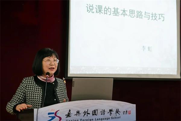 本次说课比赛分为两个阶段。第一阶段由李虹校长为全校教师进行专题讲座培训。李校长从教材分析、学情分析、确定教学目标等说课基本环节入手,逐一进行指导与经验分享。在教学设计方面,她特别强调学生的课堂活动设计要与社会生活实际相联系,并注重培养学科核心素养。