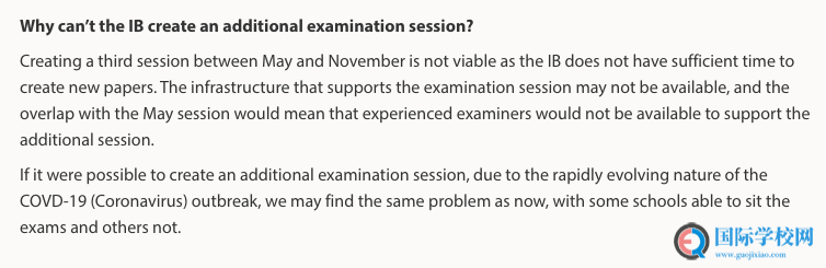 大致意思为“介于每年全球五月及十一月的大考,IB并没有足够的时间去制作新的考卷。支持考试的各基础环节可能没法用,与五月份考试重叠,意味着经验丰富的考官亦可能没有时间或精力支持额外的考试。即使退一万步来讲,IB制定出其他考试时间,鉴于疫情的迅速发展,各学校仍然会面临同样的问题,即有些学校可以参加考试,而有些学校则无法考试。”