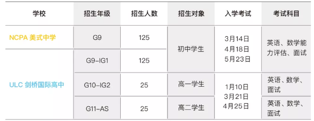 【招生年级】NCPA招收G7、G9年级新生,不招收插班生和其他年级新生(国际学生除外);ULC招收G9、G10、G11年级新生,不招收插班生和G12年级新生(国际学生除外)。