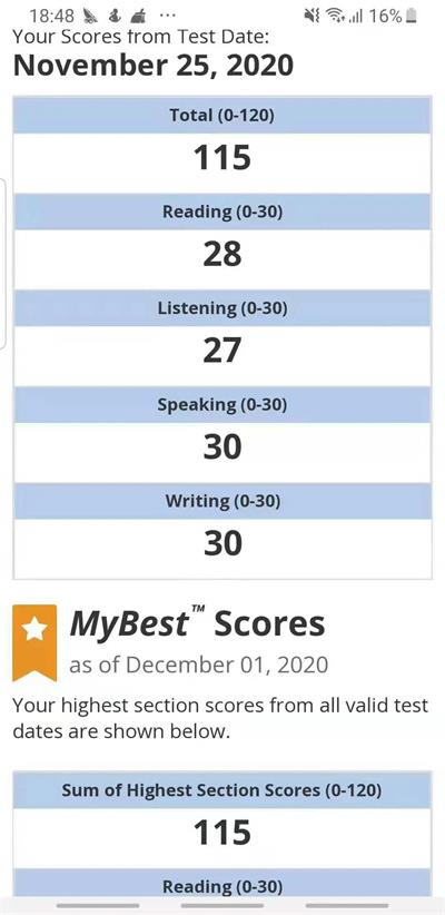 考试建议:准备点面包和水带进考场,考试是会饿的,第二部分听力结束后有十分钟能吃东西。考场上的氛围会有很大压力,所有人都在埋头做题,口语部分所有人都在说话,这时要能克服心理压力,集中在自己的题目上。写作也是,考场上其他人噼里啪啦敲打键盘的声音也要忽视,时间限制的压力也要克服,绝对不能跑题!剩下的就是正常发挥,但还不能松懈。之后就是靠运气了,不过努力之后运气是不会太差的,加油!