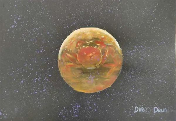 Inspired by the delicious hairy crabs served on the table, this wonderful and creative artwork portrays the plate as a planet, and the crab as a constellation.