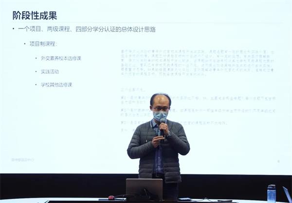 ▲王宇老师介绍《基于跨文化体验的“青年外交官”校本课程开发与实践》项目