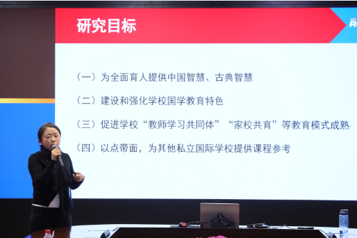 ▲樊丽娟老师介绍《基于“人格修养”与“文化融合”的K-12国际学校国学校本课程体系建设》项目