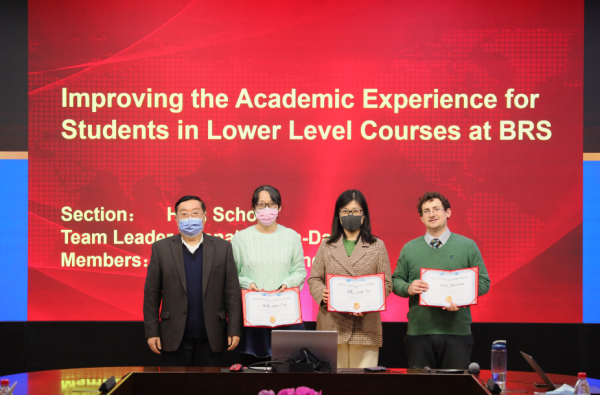 会议伊始,首先进行了校级项目《Improving the Academic Experience for Students in Lower Level Courses at BRS(如何在初级课程中提升学生的学习体验)》的结项答辩和颁奖环节。该项目致力于帮助英语水平较低的学生得到提升,通过建立“学生导师项目”研究,让高年级与低年级学生合作,以专业的导师资源建立良好的学术氛围和学习习惯。