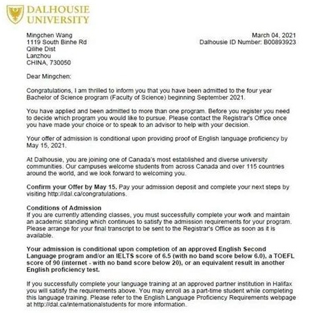 我校2021届高三毕业班学生目前已经收到四十多份offer。今天我们要为大家介绍的是一位执着的男孩——王铭晨。他只申请了三所海外大学,并且每一所都是世界顶尖学府,毫无意外地他被全部录取了。它们是稳居世界20强的多伦多大学、加拿大全国排名前15的女王大学以及戴尔豪西大学。