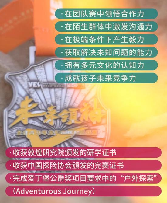 征战荒野的6天5夜里,营员们将打卡12个关卡,实现6大能力提升,收获2个证书:敦煌研究院颁发的研学证书、中国探险协会颁发的完赛证书,一块奖牌以及个人和团队奖杯,完成爱丁堡公爵奖项目要求中的“户外探索”(Adventurous Journey)这部分内容,收获一场未来领袖的成长礼。