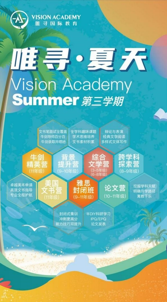 唯寻国际教育重磅推出的唯寻·夏天系列营地,覆盖3-12年级学龄段,包含牛剑精英营、美国文书营、雅思封闭营、背景提升营、论文营、跨学科探索营、综合文学营这七大特色营地,满足不同年龄段学生从兴趣培养到学科探索,从明晰方向到能力提升,直至最后的申请冲刺,保驾护航各个层次、不同阶段的需求。