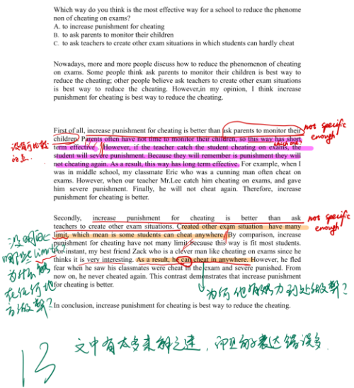 说到如何修改作业,两位写作老师Coral和Eva分享了自己之前修改学生作业的范例。Eva老师特别指出,学生在输出考试中(写作口语)往往力不从心,不完全是语言基础的问题,更多是因为知识储备不足,造成无话可说或有话乱说。所以写作老师在修改作业时,不仅要划出明显的词汇语法错误,还要指出逻辑不通顺、语意不衔接的地方,帮助学生学会合理地论证观点——这是教授写作的一大难点。