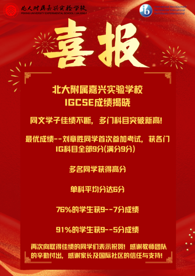 近日,2021 IGCSE成绩放榜,北大附属嘉兴实验学校同文部学子佳绩不断,突破新高!经统计,所参加的各门IG科目中,76%的学生获得9--7分成绩(满分9分),91%的学生获得9--5分成绩!科目平均分6分,刘章胜同学首次参加考试,便取得各门IG科目全部9分成绩!