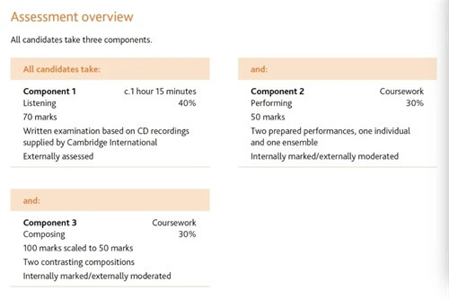 和IGCSE音乐课程内容一致,IGCSE音乐考试也为三个部分:听力笔试、演奏作品、作曲作品。