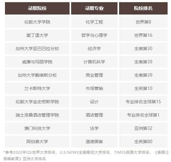 我校学生被录取的洛桑酒店管理学院,其酒店管理专业在全球位列第一名,伦敦大学金史密斯学院的艺术设计专业则在全球位列第15名。