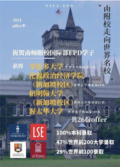 教学成绩硕果累累。其中2021年毕业生100%本科录取。47%世界前200大学录取,29%世界前100录取。优秀毕业生Susan Guo同学收到了世界排名17的多伦多大学等多所世界名校的offer。