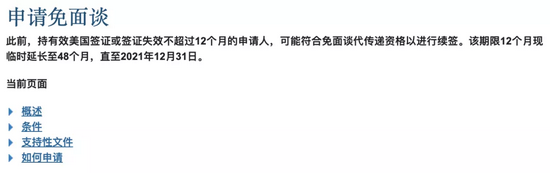 申请页面显示,如果年龄符合特定年龄段必须为14岁以下和80岁(含)以上,或者美国签证依然有效或失效后12个月内(现暂为48个月,直至2021年12月31日)进行续签,都将有可能符合申请免面谈的条件。