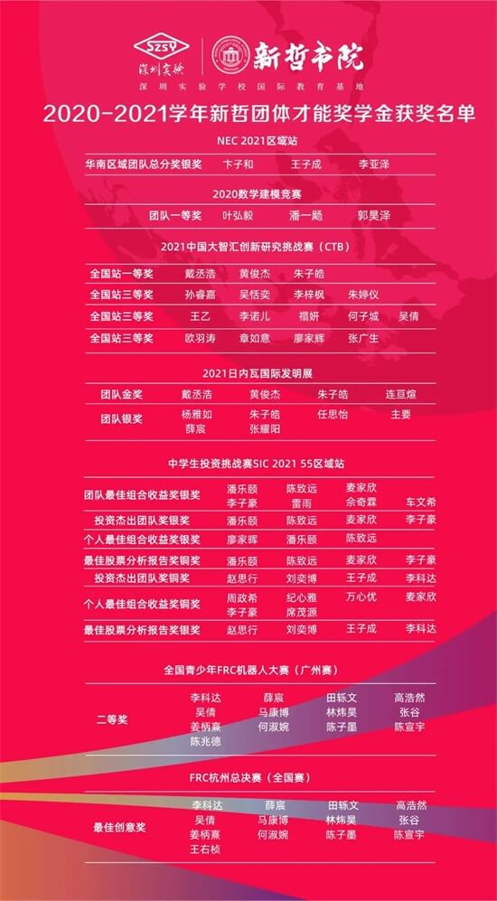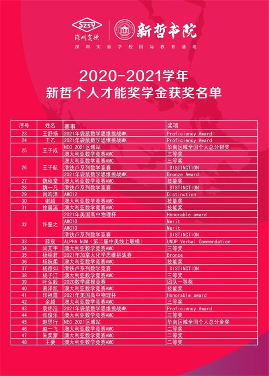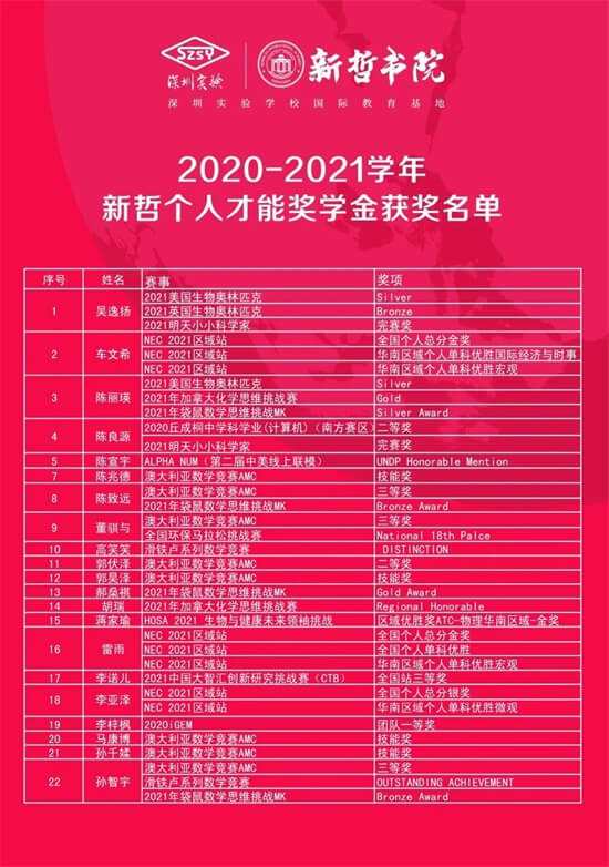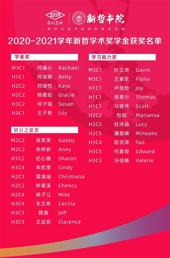 深圳新哲书院2020-2021学年奖学金获奖名单公布