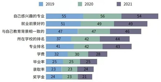 对大多数留学生来说,兴趣度成为专业选择的首要考虑因素,其次是对于就业前景和学校水平也较为看重。