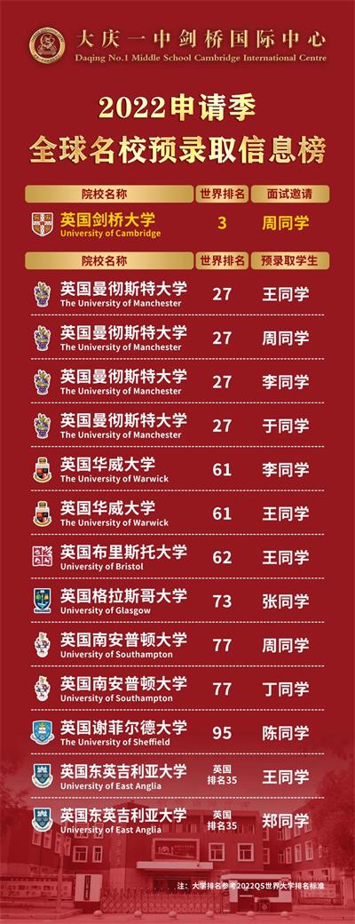 【2022申请季】大庆一中剑桥国际中心剑桥面邀+首批offer荣耀来袭