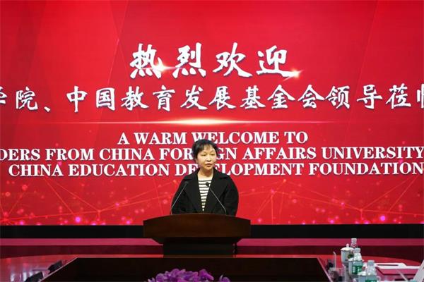 中国教育发展基金会处长王蕊对近年来王府学校以建设智慧校园为目标,在移动教学领域取得的丰硕办学成果表示祝贺,同时感谢北京王府学校的捐赠以及外交学院在培养外交人才上的辛勤耕耘,并表示中国教育发展基金会和外交学院合作由来已久,尤其基金会还承担着财政配比工作的审核任务,希望能以此次王府学校捐赠为契机,助力外交学院能培养出更多具有全球视野的一流外交人才,输送给祖国外交事业,推动构建人类命运共同体,开创中国特色大国外交新局面,为全面建设社会主义现代化强国做出应有贡献。