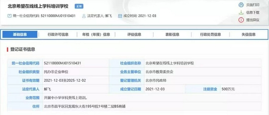 根据全国社会组织信用信息公示平台的相关资料,上述5家组织的成立时间皆为2021年12月3日。北京希望在线线上学科培训学校、北京志道线上学科培训学校、北京作业帮线上学科培训学校、北京乐学东方线上学科培训学校等4家机构注册资金为500万元,北京猿辅导线上学科培训学校注册资金为1000万元。