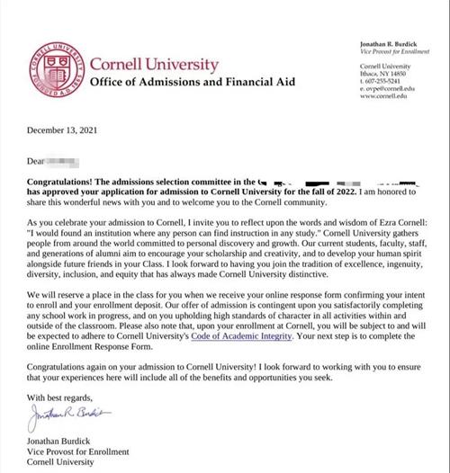 收到康奈尔大学的录取通知时,我几乎不相信我的眼睛,但是充满了胸膛的欣喜激动和同学老师们热情的祝贺让我确定了我的成功不是梦境。我首先想感谢的是在申请期间不断支持我的家人们、同学们和老师们。