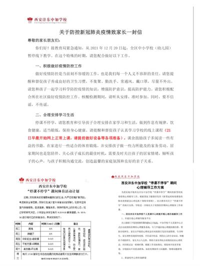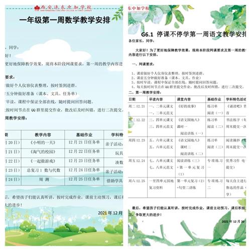 西安沣东中加学校在执行校长雷晓敏的带领下迅速开展线上教学会议,认真制定《停课不停学工作方案》,教学处及时制定线上教育教学工作计划,各学段结合学校课程,编排线上学习课程表,德育处下发《致家长的一封信》,中层人员蹲点到学段,进入到班级群,关注线上教学的顺利开展,关注学生的健康成长。老师们积极响应,克服各种困难,从课程安排,上课模式,线上指导等各个环节准备网络授课工作,停课不停学,停课不停教。