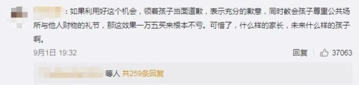 但正如新闻评论下的网友所言:“如果利用好这个机会,领着孩子当面道歉,表示充分的歉意,同时教会孩子尊重公共场所与他人财物的礼节,那这效果一万五买来根本不亏。”