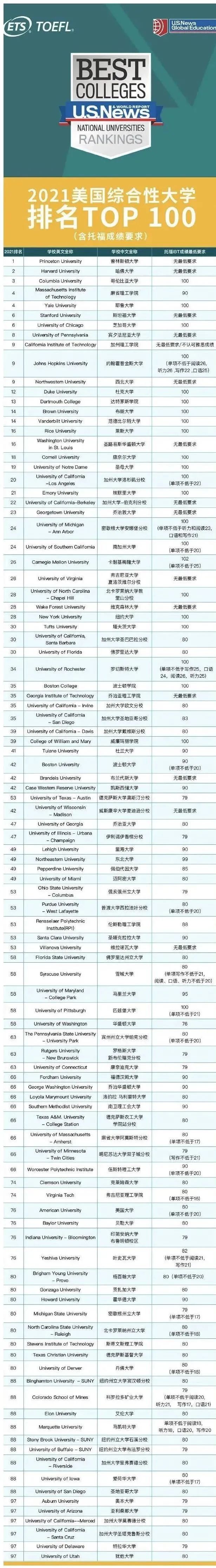 2021U.S.News TOP100院校托福成绩要求