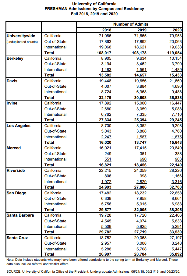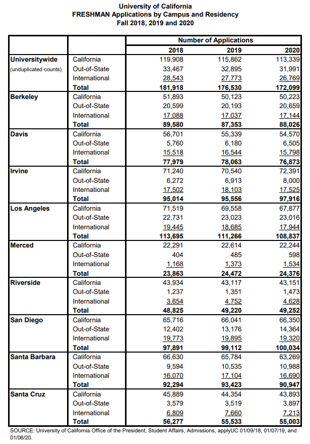 8月份,UC公布了最新的录取数据,在17万2308名申请人中,加州大学系统下的九所本科学校共录取11万9054名学生。2020年UC新生整体录取率提高了8%,达到69.2%。