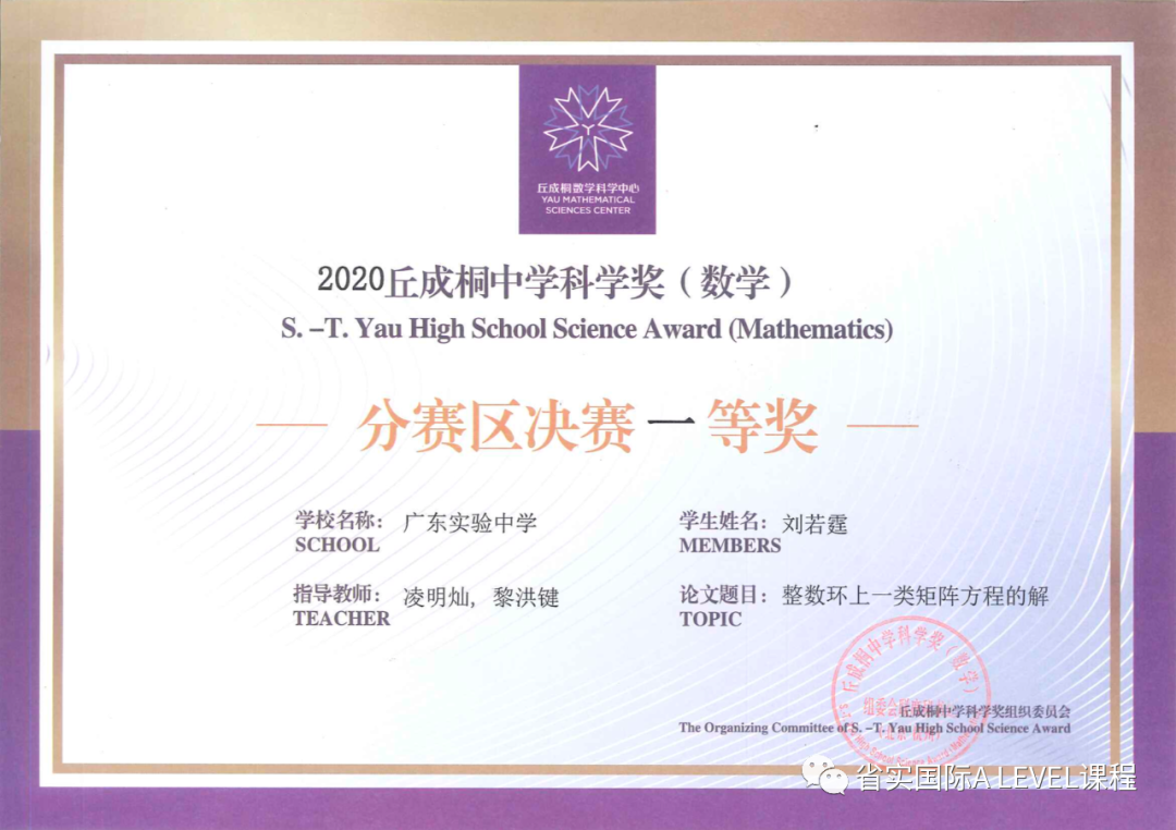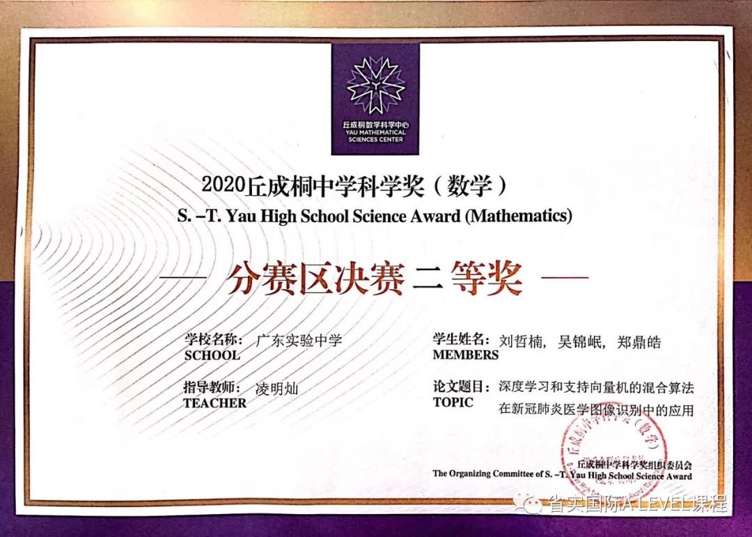 此外,省实A-LEVEL郑鼎皓同学所在团队获得了2020丘成桐中学科学奖南部赛区二等奖!