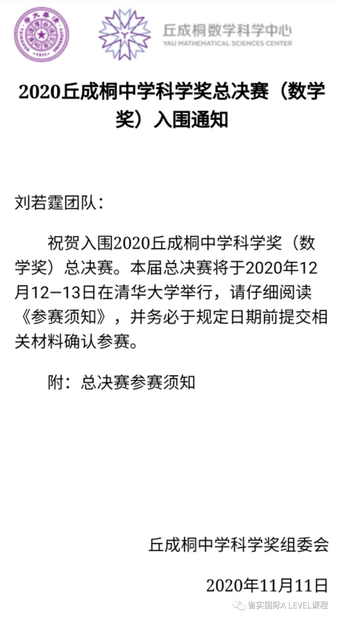 竞赛喜报 | 省实A-LEVEL学子入围2020丘成桐中学科学奖全国总决赛!